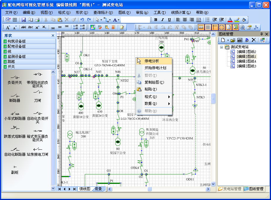 配電網(wǎng)絡(luò)管理可視化系統(tǒng),是按《電氣符號國家標(biāo)準》提供統(tǒng)一的電網(wǎng)圖標(biāo)設(shè)計,具有強大的繪圖功能、饋線圖管理功能、饋線圖的審批流程、在線修改饋線圖、實時查看饋線圖、設(shè)備與圖紙緊密結(jié)合、完整的資產(chǎn)管理與強大的資產(chǎn)信息查詢與統(tǒng)計功能、電力用戶信息管理、停電分析功能、線損計算功能等。